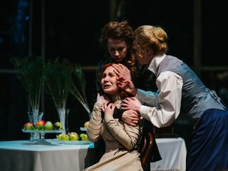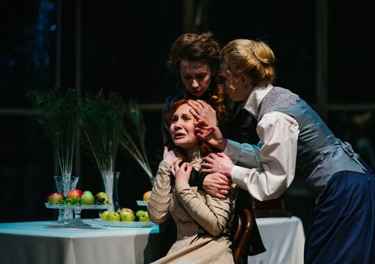 Между героями и публикой — тонкая грань. Пришедшие на спектакль ещё рассаживаются на свои места, а в зале уже накрывают на стол в ожидании гостей. У младшей сестры Ирины — именины! Первый ряд театралов участвует в застолье, сидя за белой скатертью с чеховскими героями и угощаясь самыми настоящими пирогами и напитками. Тут же поминая отца трёх сестёр, встают с бокалами в руках. «Надеюсь, что и на следующих показах зритель проявит душевную тонкость: когда поминают человека, неплохо бы встать», — Глеб Володин.