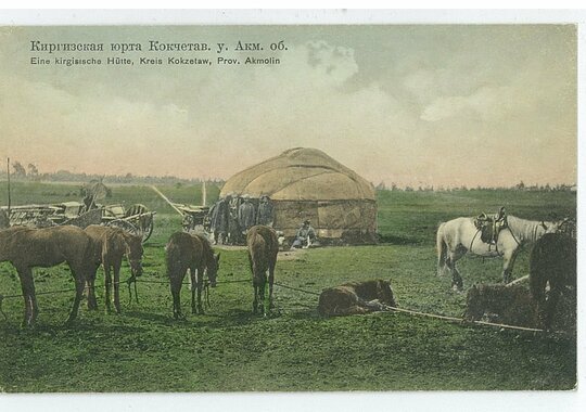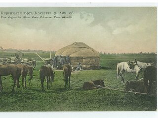 «Быт и хозяйство казахов в открытках» в этом разделе представлены сцены из повседневной жизни: чтение книг, рукоделие, угощение кумысом, охота, виды степей, юрт и этнические образы. Открытки служат не только средством визуальной коммуникации, но и ценным этнографическим источником.