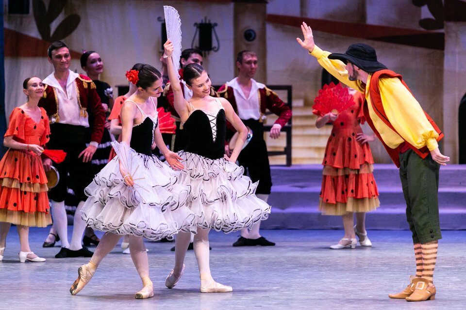 На площади в Барселоне у таверны Лоренцо веселится народ. Здесь и задорная Китри, дочь Лоренцо, и влюбленный в нее цирюльник Базиль. Но Лоренцо не угоден бедный жених. Куда более ему по сердцу богатый дворянин Гамаш, который также не прочь жениться на Китри. Но такого замужества девушка не желает. Они с Базилем решают бежать. Толпа приветствует уличную танцовщицу и тореадора Эспаду. Общее удивление вызывает появление рыцаря Дон Кихота. Путешественника приглашают к столу. Девушки потешаются над стариком Санчо Панса. Дон Кихот поражен красотой Китри. Не она ли в образе прекрасной Дульсинеи являлась ему в грезах? Он по-рыцарски ухаживает за ней, и Китри преображается в Дульсинею. За ней, ускользающей с площади, устремляется Дон Кихот. Его сопровождает преданный Санчо Панса.