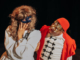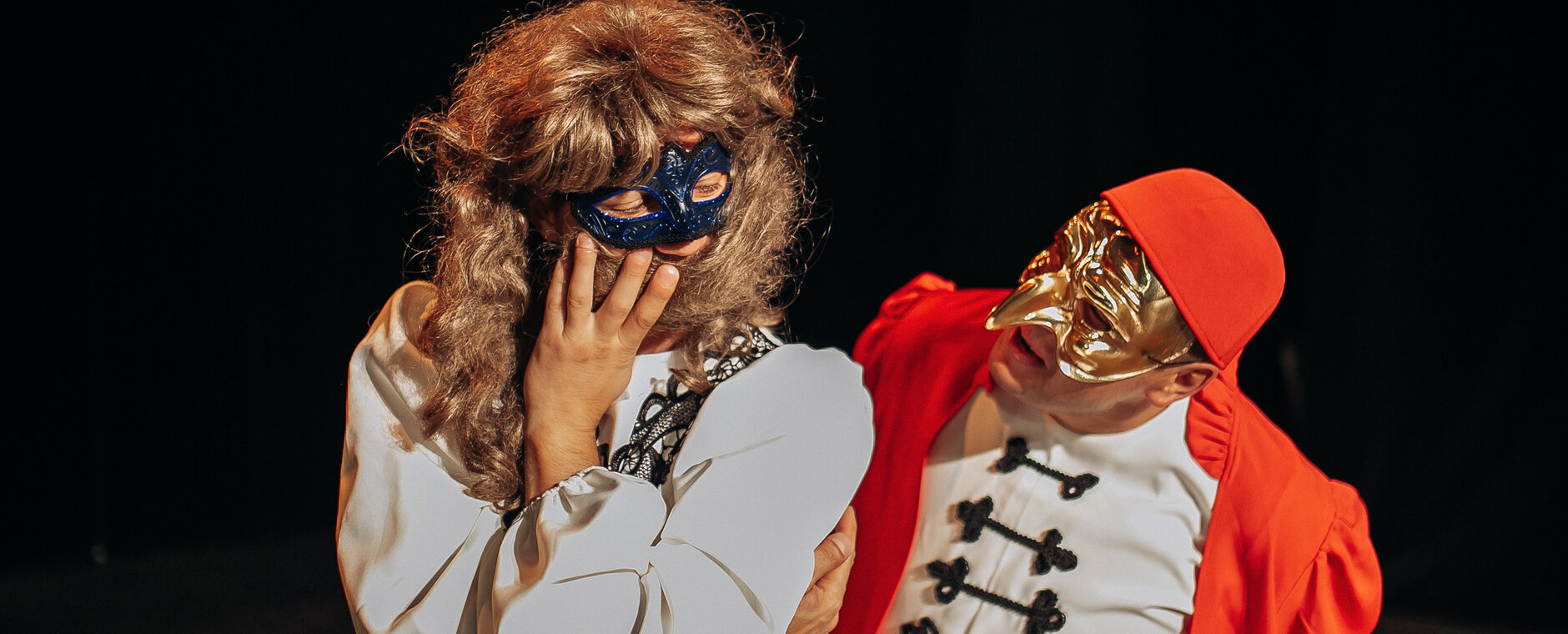 Комедийный спектакль «Полоумный Журден» исполняется в стиле традиционного итальянского театра Дель-Арте.