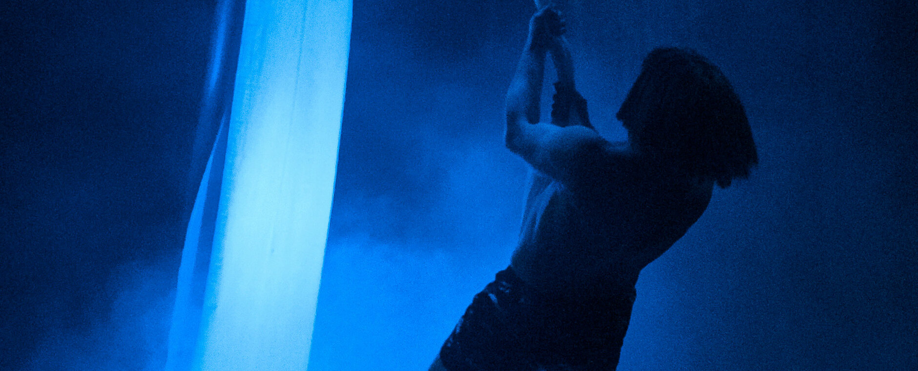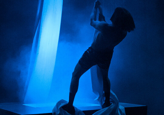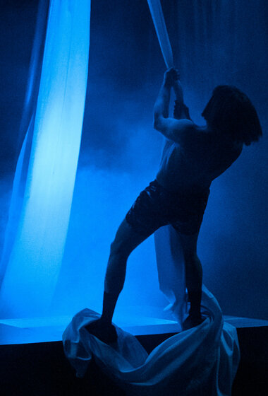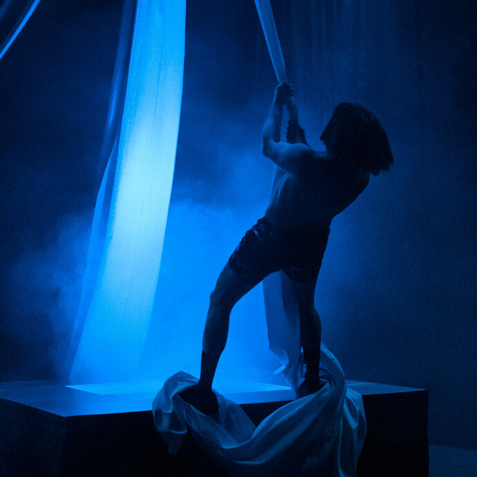 Герои спектакля живут на пружинах. Опора их существования — это: не то стол, не то детская люлька, не то плоская Земля, одиноко плывущая в окружающей тьме.