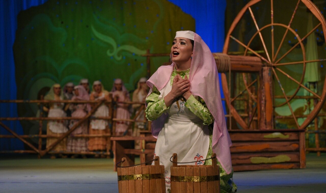 Спектакль – визитная карточка татарского театра. Зрительский интерес к этой постановке не ослабевает, а пьеса давно обрела легендарный статус. Непреходящая популярность «Голубой шали» – пьесы, написанной еще в 1926 году, – порождает загадки. Принципиальная незатейливость фабулы, ее фрагментарность, расподобление действенно-смысловыми ходами и музыкальными метафорами, тип связи «сцена – зал», предусматривающий активное участие зрителя в действии, арии-монологи главных героев, хоры воздействуют на подсознание, порождают каскад ассоциаций.