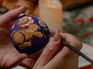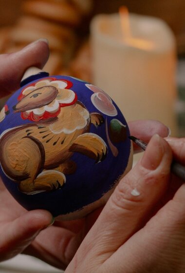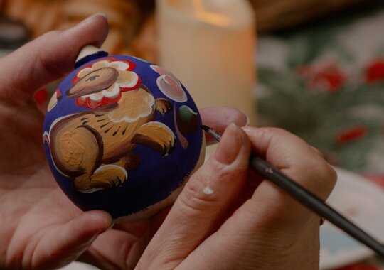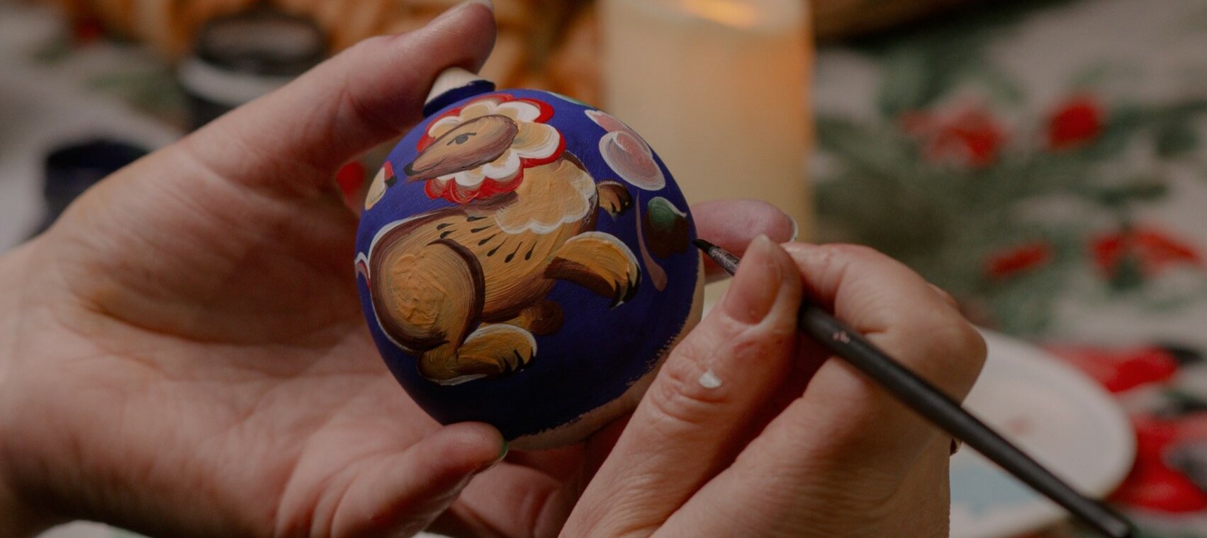 Под руководством мастерицы вы изобразите на ёлочном деревянном шаре один из сюжетов домовой росписи. В прошлом она была знаковым атрибутом интерьера в избах Русского Севера. Цветы и деревья, животные и птицы украшали главные места в доме — прялки, шкафы, входную дверь, сундуки, место возле печи. Расцвет этого ремесла пришёлся на 1880–1910 годы.