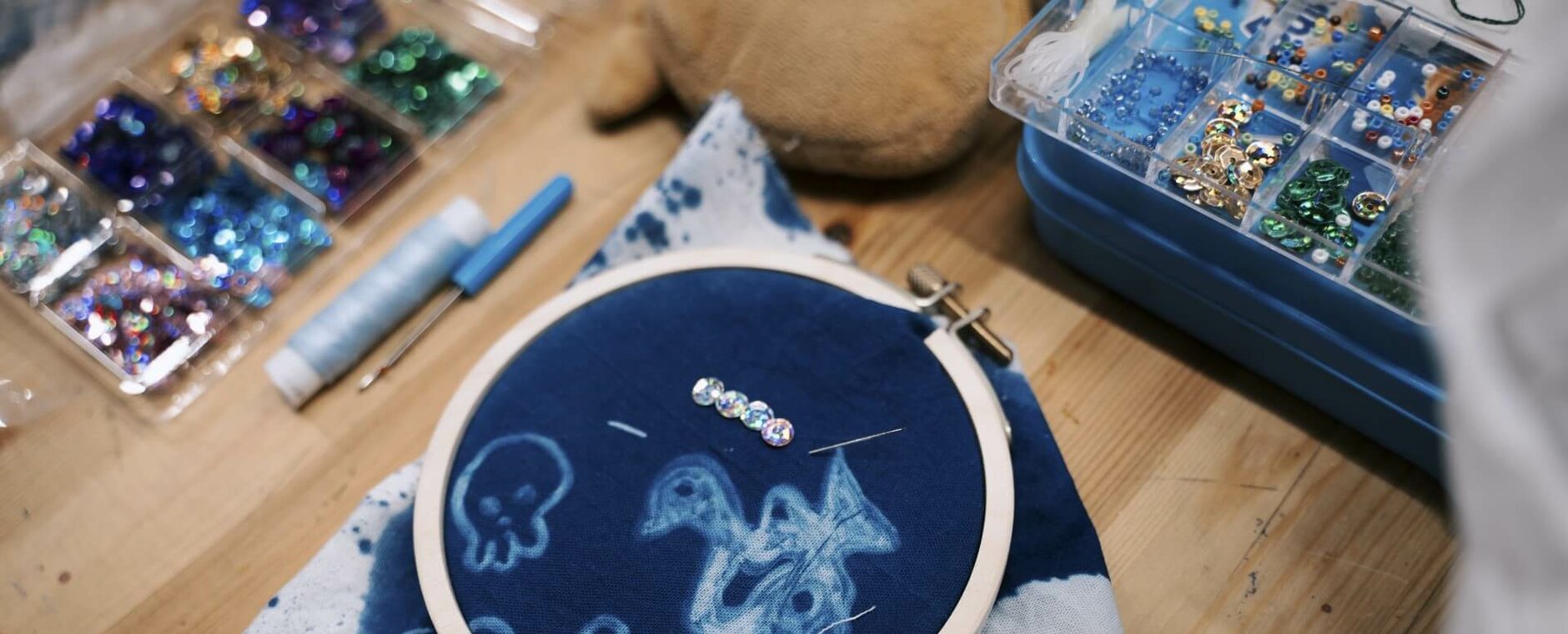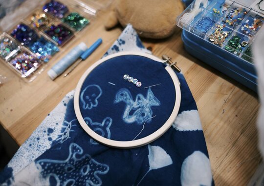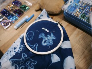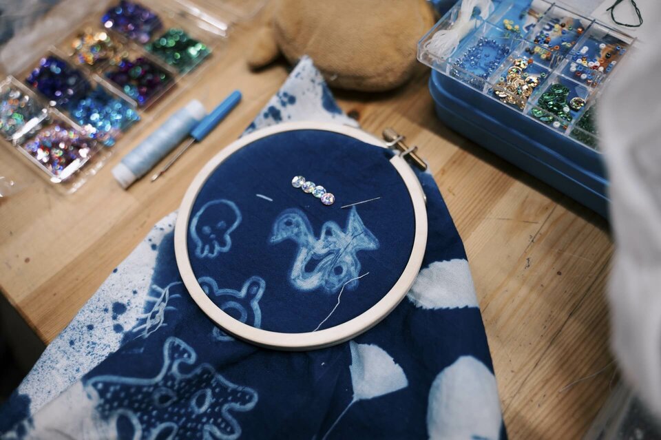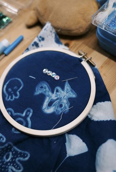 Художница Анастасия Безвершук переосмысляет традиционную цианотипию, сочетая её с разнообразными материалами: от антикварных рам и текстиля до бисера и архивных фотографий. Её авторский курс, рассчитанный на 5 занятий, последовательно раскрывает все тонкости этого альтернативного метода печати.
