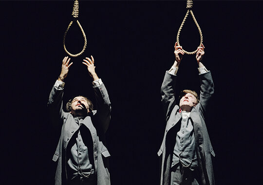 В спектакле мы увидим хрестоматийный сюжет глазами двух второстепенных персонажей – приятелей Гамлета по университету: Розенкранца и Гильденстерна. Их позвали, чтобы они по-дружески выведали у Гамлета причину его странного поведения. У Шекспира Розенкранц и Гильденстерн – предатели. В нашем спектакле это еще и несчастные люди, не понимающие, как они могли попасть в такой переплет, и не имеющие сил сопротивляться судьбе. Это два обычных и даже заурядных человека, но только они выглядят нормальными людьми, в то время как все остальные персонажи шекспировской трагедии предстают одержимыми безумцами.