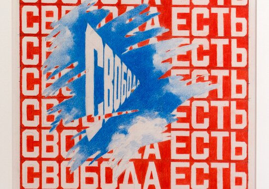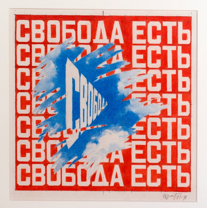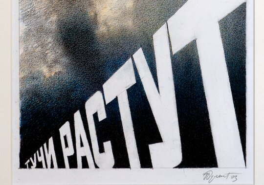 Один из залов экспозиции будет посвящен поэзии Всеволода Некрасова, близкого друга и единомышленника Эрика Булатова. Инсталляция со стихотворениями разных лет позволит зрителю сначала сфокусироваться на поэтическом тексте, а затем увидеть, как с ним работает художник в своих графических произведениях.