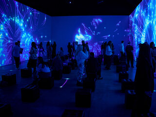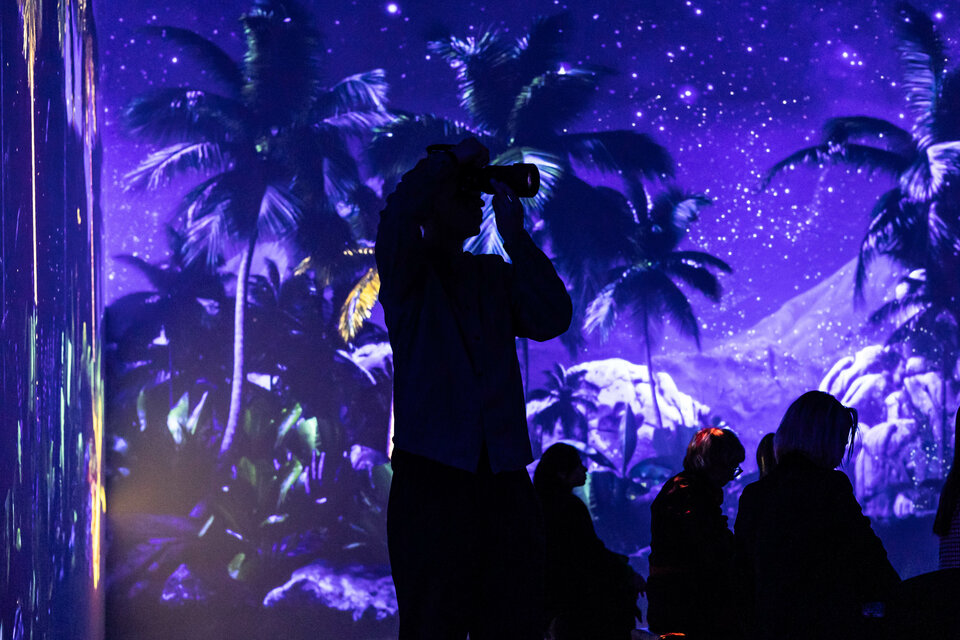 Шоу завершается интерактивной частью. Стены проекционного зала реагируют на перемещения посетителей — движения тела и рук.
