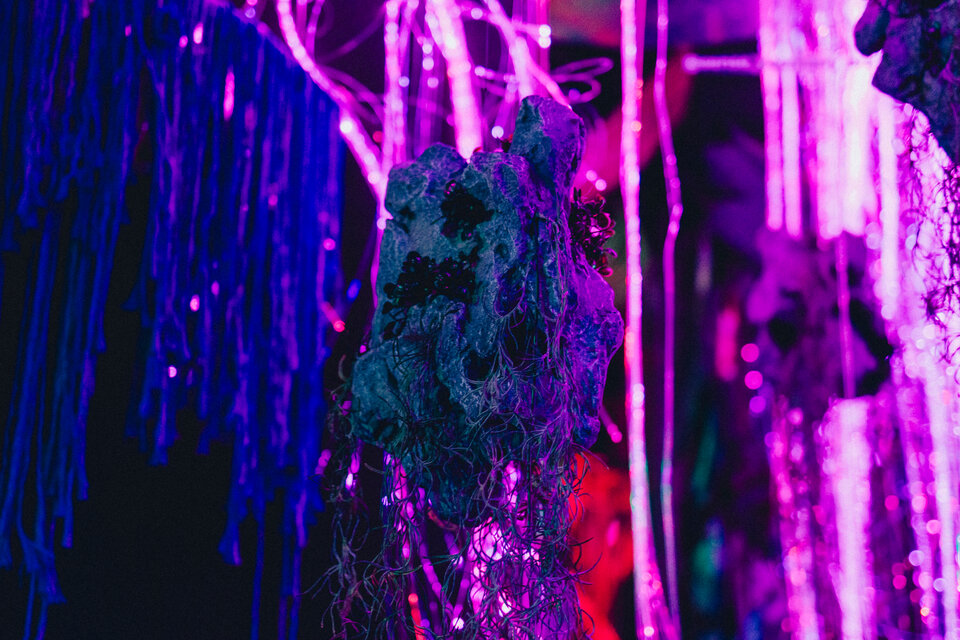 «Недра» — site-specific инсталляция в зале Земли, созданная совместно с ИИ, пространство, сотканное из гибких ивовых лент, спускающихся с потолка до пола, символизирующее объятия самой природы.