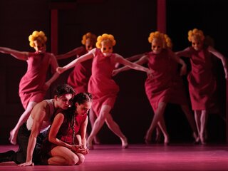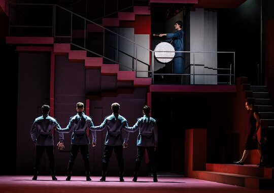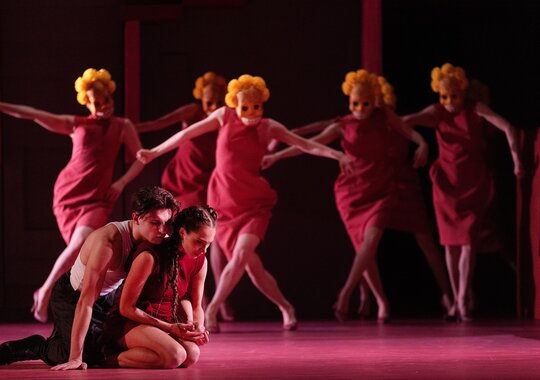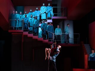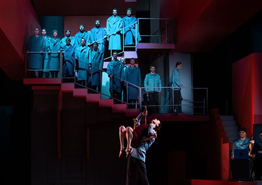 Образ спектакля — это тоже пространство внутри головы, которое выстраивается как бесконечная лестница Маурица Эшера, «невозможный объект», ведущий одновременно и вверх, и вниз. Сценограф Лариса Ломакина добавляет красный цвет, как в архитектурных шедеврах каталонца Рикардо Бофилла, чтобы наша зрительная память сразу откликнулась: Кармен — это, конечно, красное.