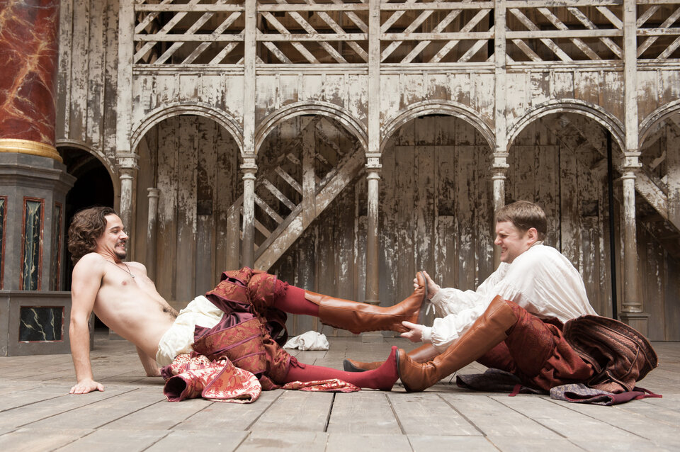 С пресловутой «народностью» пьесы зритель сталкивается ещё на подходе к «Глобусу» — в образе пьяного вдрабадан медника Слая, которого режиссёр Фроу остроумно нарядил в майку фаната сборной Англии по футболу. Этот пролог отсылает к другому знаменитому «Укрощению» — постановке Королевской Шекспировской компании 1978 года, в которой режиссёр Майкл Богданов заставил Джонатана Прайса шокировать публику пьяными эскападами и крушить декорации на сцене. Сорок лет назад потрясённые зрители вскакивали с мест и бежали звонить в полицию; искушённая публика нашего времени лишь посмеивается над поддатым мужланом.