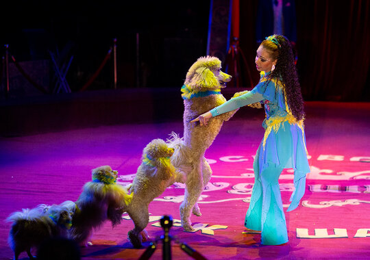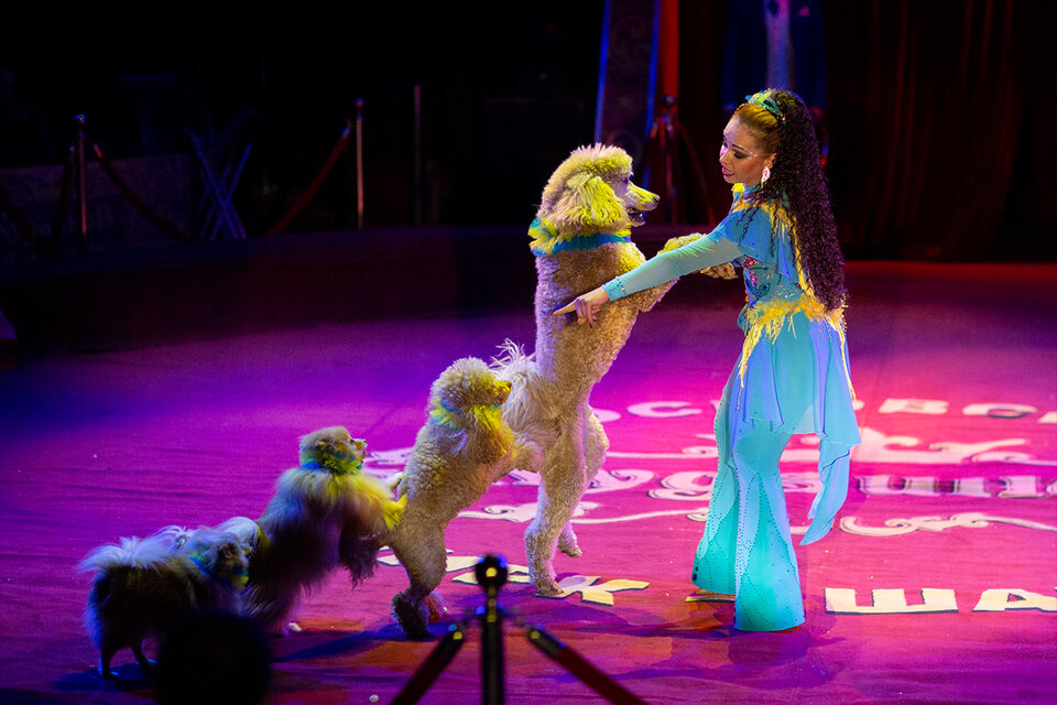 Танцы, свет и шоу-балет. Украшает представление. Шоу-балет цирка кудзинов. Под руководством шпрехшталмейстеров Оксаны Кудзиновой и Андрея Вяжевича — стильные массовые постановки, танцы и парады под куполом цирка.