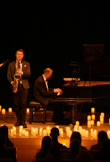 Вечер, старинный музей, мягкий полумрак зала — и музыка, которая течёт свободно. Джаз здесь не про форму, а про настроение: гибкие ритмы, тёплый звук, импровизация, которая рождается на ваших глазах. В свете сотен свечей мелодии звучат иначе — ближе, пластичнее, насыщеннее дыханием и интонацией момента.