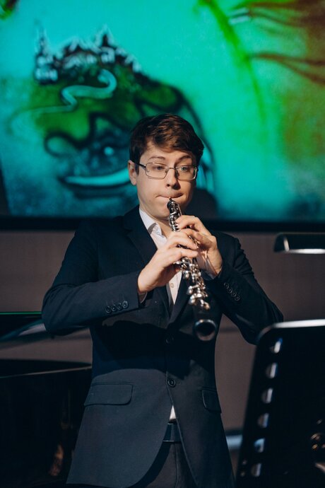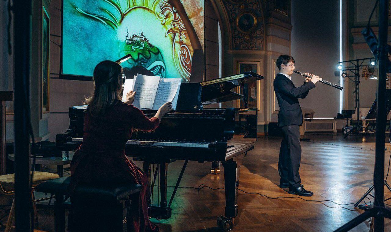 На сцене музыканты — Елена Эндеберя, фортепиано; Петр Степанов, гобой; Елена Мартьянова, гусли звончатые.
