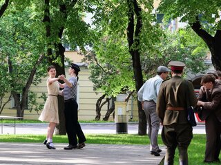 Зрители проходят маршрут от театра Армии через Екатерининский сквер мимо памятника Воинам, отстоявшим мир и свободу в борьбе с фашизмом, музея Истории ГУЛАГа до парка на территории Всероссийского музея декоративного искусства.