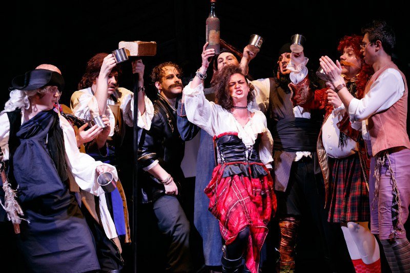 Музыкальная феерия «Остров сокровищ» появилась как дипломный спектакль выпускников Театрального института им. Б. Щукина. Художественный руководитель Театра «У Никитских ворот» Марк Розовский увидел студенческую постановку и был очарован её истинно вахтанговским духом и яркими актерскими работами. Пиратская комедия приключений, как называют спектакль создатели, наполнена громкой музыкой, искрящимся юмором и эффектными трюками. «Остров сокровищ» – это яркое действо, где связанные единым сюжетом сцены динамично сменяют друг друга, артисты в образе благородных героев или ужасных пиратов, отправляясь в опасное морское путешествие за сокровищами, борются с водной стихией, стреляют, сражаются на шпагах, а ещё – смеются, поют и танцуют… Всем, кто знает толк в ветрах странствий и приключениях, от юных до весьма взрослых, постановка придется по душе. Зрители из городской суеты перенесутся прямиком на остров «Сундук мертвеца», со всех сторон омываемый океаном. Текст романа, написанного в 1883 году, звучит очень современно. Этому способствуют слегка «усовершенствованный» юмор и то, что герои спектакля частенько напоминают персонажей самых известных и любимых фильмов и мультфильмов о пиратах. Итак, подросток Джим Хокинс очень любит истории о морских приключениях и мечтает стать капитаном…