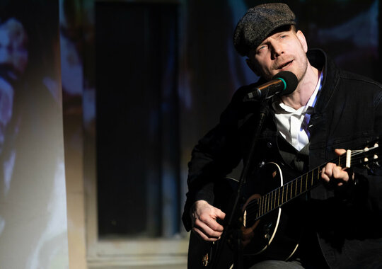 «Маяковский. Прогулка» — это не просто чтение стихов или исполнение их под гитару. Это попытка подключиться к Владимиру Маяковскому, как к «маяку», и за час с небольшим пройтись с ним рука об руку, как со старым приятелем, по «бурным рекам» его биографии.