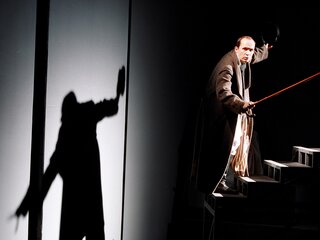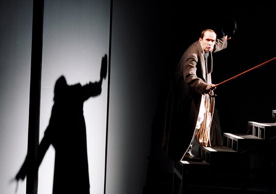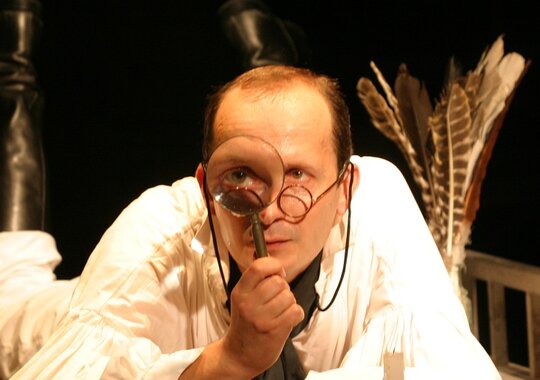 История маленького человека с большими амбициями начинающаяся в маленькой петербургской комнатенке, а заканчивающаяся в сумасшедшем доме, поначалу звучит с добродушной насмешкой, легко, чуть иронично и немного лирично. Но постепенно интонация спектакля обретает густые, мрачные черты, вызывая в памяти гротесковые пьесы Сухово-Кобылина.