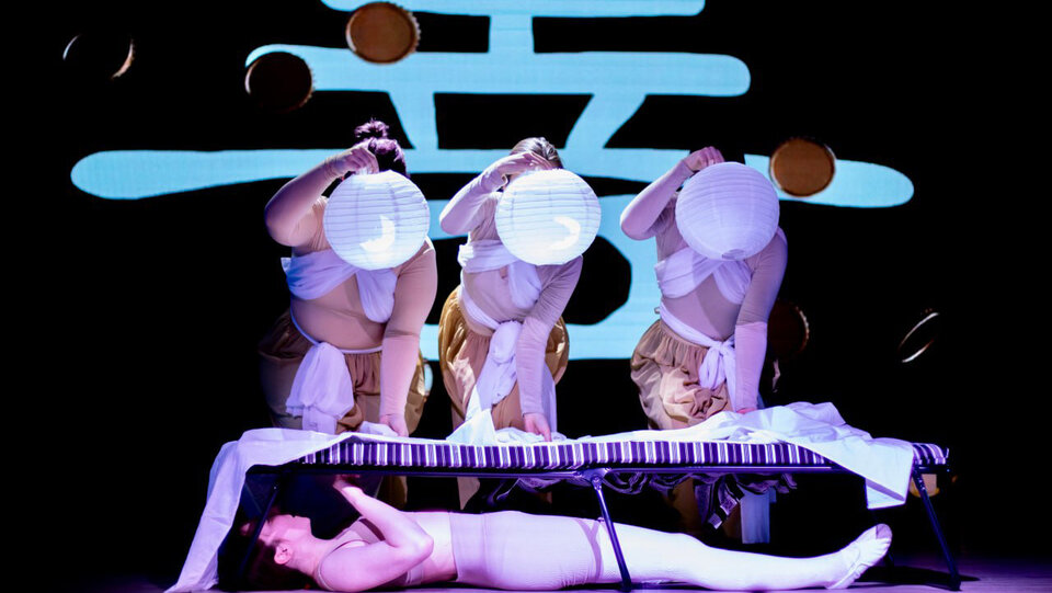 Авторские зонги, музыкальные номера, монологи на немецком и стендап в сочетании с драмой в неокитайском стиле — всё это составляющие пьесы-притчи в экспериментальной постановке о том, как оставаться человеком в жестоких реалиях.