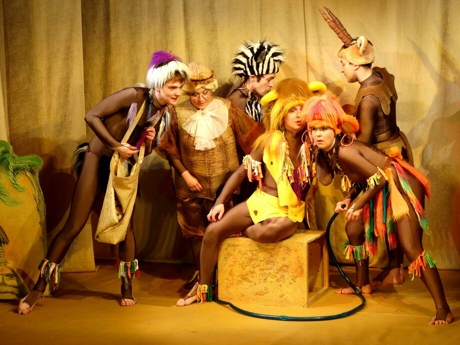 Спектакль проходит в маленьком зале, зрители сидят рядом со сценой и могут почувствовать себя участниками всех событий: вот наводнение на двигается на Африку, и царь Лев созывает подданных, чтобы услышать их предложения. Страус предлагает разные способы бегства, Антилопа считает, что мир спасет только красота и искусство, Зебра полагает, что на неприятности нужно смотреть философски, и вслед за черной полосой наступит белая полоса. И только Обезьяна решает действовать и отправляется в таинственное подводное царство, где обитают светящиеся медузы, темные акулы, яркие рыбки, лангуст и настоящий дракон.