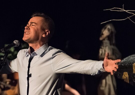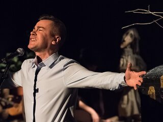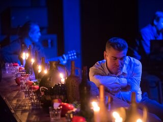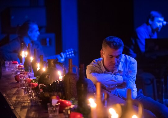 «Один мудрый человек сказал: если долго идешь, не зная куда, не удивляйся, если в конечном итоге попадешь в никуда. Сегодня вы шли в театр, а попали в гости», — сообщают зрителям в начале спектакля актеры. Впрочем, термин «спектакль» в привычном понимании этого слова к «Каплям датского короля» прямого отношения не имеет. В Театре Елены Камбуровой основой драматического действа всегда является песня, «Капли» — не исключение. Зрителей усаживают за накрытый стол, актеры, разместившись напротив, молитвенно складывают руки и начинают петь «Виноградную косточку». «Капли датского короля» — вечер воспоминаний о Булате Окуджаве, мероприятие камерное и почти интимное. Отрывки из автобиографии барда зачитываются с таким выражением, будто все присутствующие приходятся Булату Шалвовичу родственниками. Знакомые с детства песни дополняются небольшими инсценировками: актеры дружно позируют «На фоне Пушкина», маршируют под песню «О бумажном солдатике» и передают из рук в руки игрушечного «московского муравья». К финалу действия зрители начинают активно подпевать, некоторые тайком утирают набежавшую слезу. Потому что уж больно душевно в гостях у Театра музыки и поэзии: о «Часовых любви» поют так, что чудится, будто ты сам вдруг стал героем «Покровских ворот», а значит, на дворе всегда апрель, по которому сам бог велел дежурить.