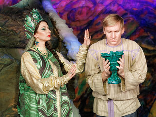 В спектакле «Медной горы хозяйка» звучит живая музыка: русские народные песни и ария из оперы Модеста Мусоргского «Хованщина».