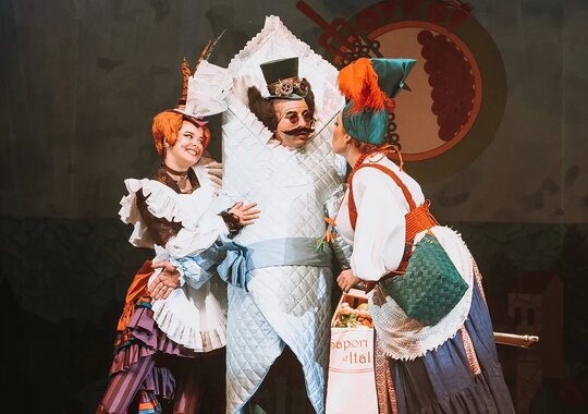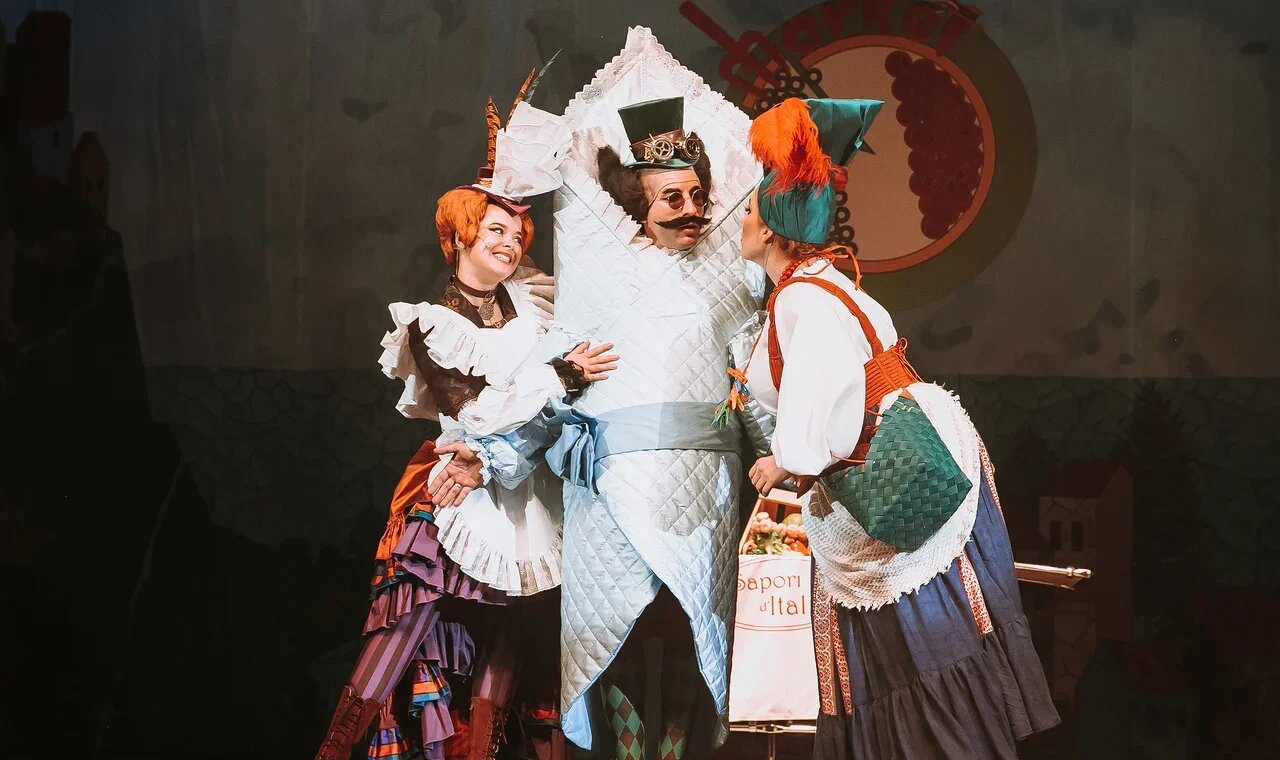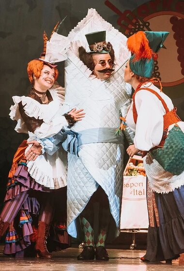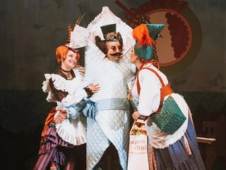 Зрителей ждут захватывающие погони, акробатические трюки, заводные танцы и настоящие мыльные пузыри. В финале спектакля, как и на экране телевизора, главный герой и его друзья попадут в волшебный мир за «маленькой дверцей». В нём наряды от кутюр дополняют средневековый декор. Известная на весь мир история здесь впервые поставлена в классическом итальянском жанре — комедии дель арте, которая была рождена из уличной импровизации.