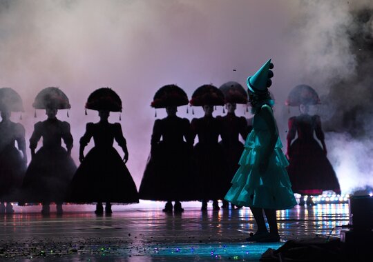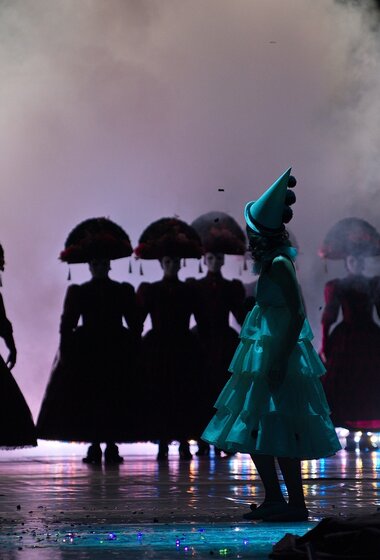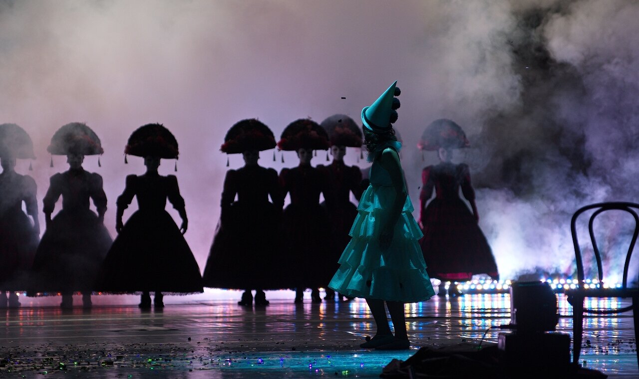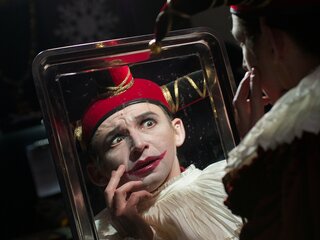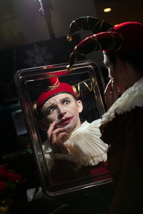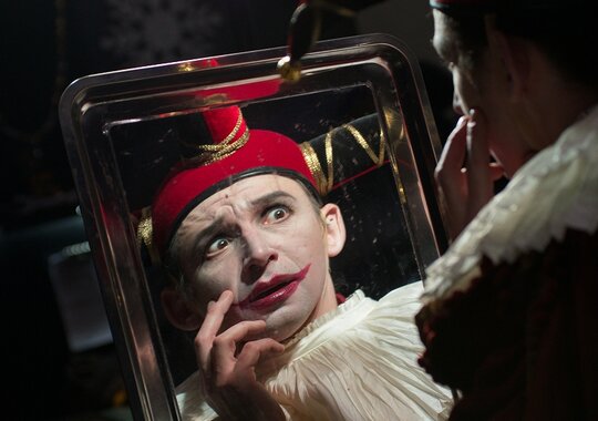 Мы много спорили с художником Максимом Обрезковым о том, как должна выглядеть эта история. В конце концов возникли два образа, важных для нашей постановки — зеркало и маска. Зеркало — это совершенный портал в другой мир. А маска — это Италия, отсылка к старым итальянским постановкам. С масками соседствуют современные костюмы. На сочетании этих временных полюсов и строится спектакль. Происходит соединение современного и архаического театра».