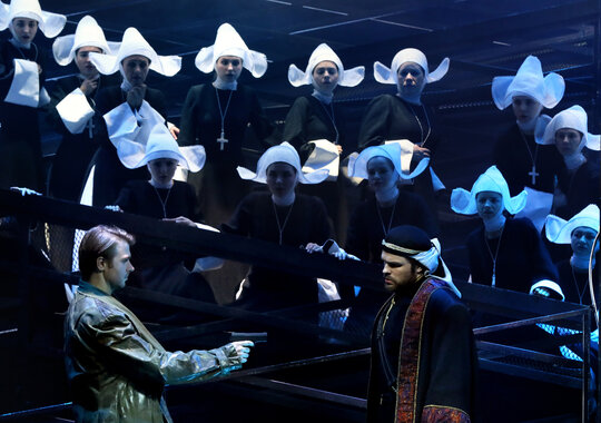 Всё, что происходит на сцене, кажется настолько реальным, что захватывает дух. Чувства героев оперы отнюдь не театральные. Они такие же подлинные, как и слезы зрителей. Рядом в стилизованных руинах Пальмиры — иллюзионный театр, в котором артисты проживают театральные страдания, чувства, любовь. А управляет всем великая и прекрасная музыка Верди…