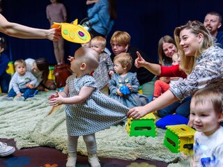 Малышам потребуется сменная обувь. Взрослые проходят в зал носочках.