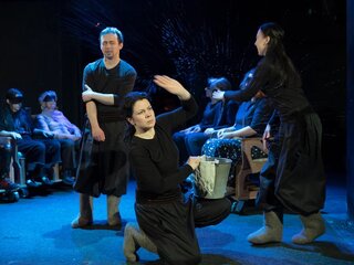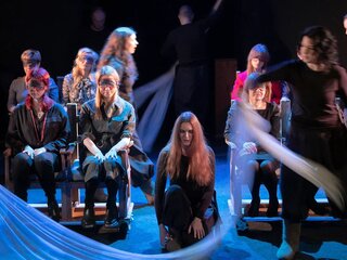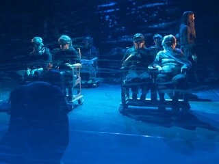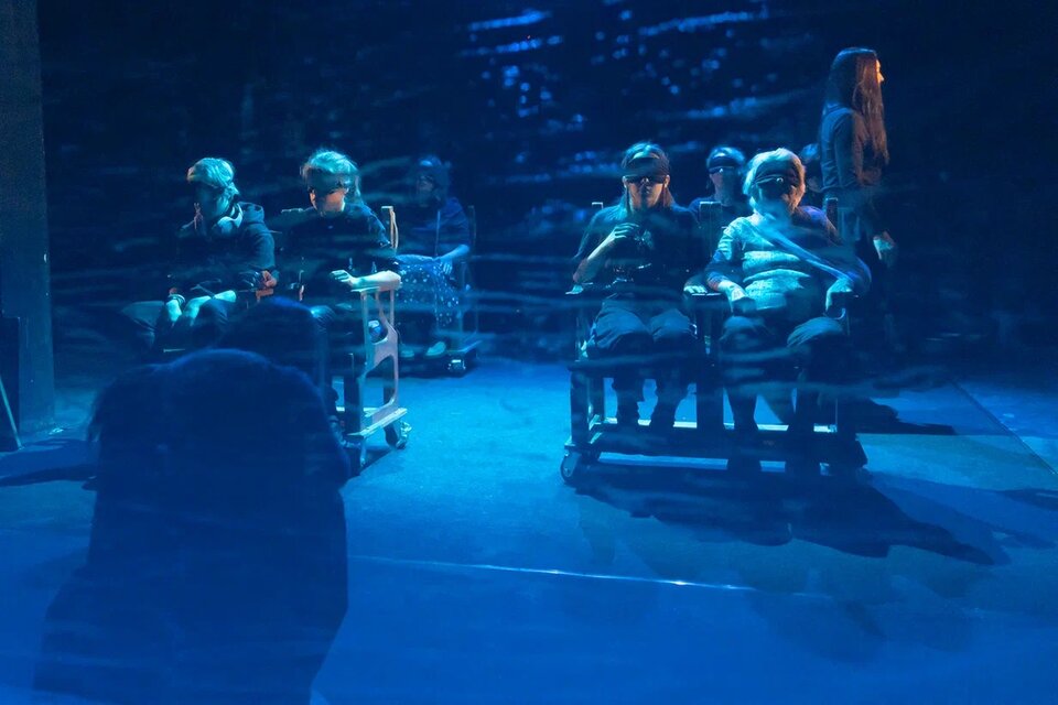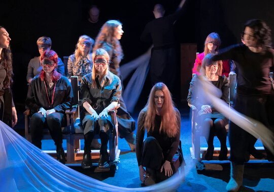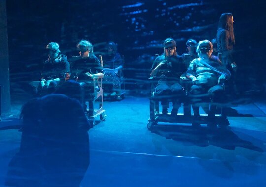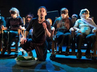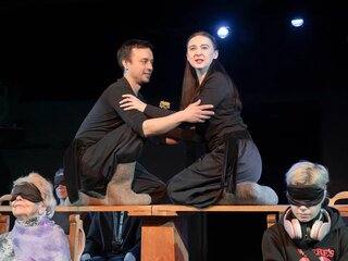 Зрители на сцене проводят в повязках на глазах весь спектакль, зрители в зале могут сами выбрать — снять их или оставить до конца. Но многие забывают о повязках, и остаются с ними: то, что рисует их воображение, намного богаче того, что может увидеть человеческий глаз.