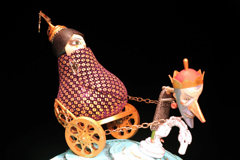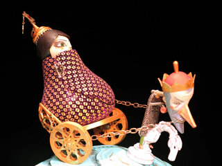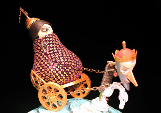 На сцене два исполнителя: актриса-рассказчица, управляющая всеми куклами, и музыкант, играющий на 9 необычных музыкальных инструментах.