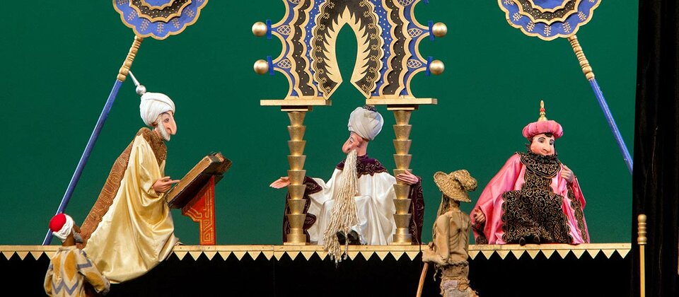 Это один из самых красивых спектаклей театра: восточный город с золотыми дворцами, магия сказочных превращений и грациозные тростевые куклы, а также грозный Джинн Кашкаш. «Волшебная лампа Аладдина» – один из самых романтичных спектаклей, в котором горячий и смелый юноша Аладдин ради любви к прекрасной царевне Будур вступил в борьбу с коварным и алчным визирем, преодолев все преграды.