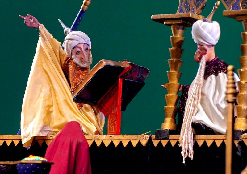 Это один из самых красивых спектаклей театра: восточный город с золотыми дворцами, магия сказочных превращений и грациозные тростевые куклы, а также грозный Джинн Кашкаш. «Волшебная лампа Аладдина» – один из самых романтичных спектаклей, в котором горячий и смелый юноша Аладдин ради любви к прекрасной царевне Будур вступил в борьбу с коварным и алчным визирем, преодолев все преграды.
