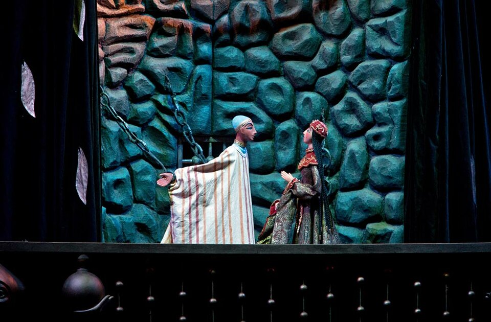 Это один из самых красивых спектаклей театра: восточный город с золотыми дворцами, магия сказочных превращений и грациозные тростевые куклы, а также грозный Джинн Кашкаш. «Волшебная лампа Аладдина» – один из самых романтичных спектаклей, в котором горячий и смелый юноша Аладдин ради любви к прекрасной царевне Будур вступил в борьбу с коварным и алчным визирем, преодолев все преграды.