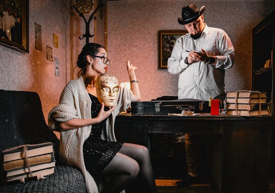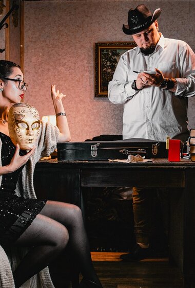 Он называет себя Кредо — неуловимый вор, который легко перемещается во времени и пространстве в охоте за редкими драгоценностями, антиквариатом и мировыми шедеврами. На его счету десятки виртуозных ограблений, увы, до сих пор оставшихся нераскрытыми... Что движет загадочным воришкой? Действует ли он в личных интересах или работает по заказам подпольных коллекционеров? Каким будет следующий шаг Кредо? Ответы на эти вопросы придется найти вам самим. и, пожалуйста, поторопитесь! Наши помощники из Центра Управления Временем засекли подозрительную активность в парижском театре «Гран Гиньоль». Возможно, это наш шанс остановить преступника и раскрыть его личность! Особенности квеста Чистая и безопасная локация, стилизованная под парижский театр 1957-го года 3 профессиональных актера в игре одновременно Без скримеров и пугающих эффектов — подходит для всей семьи. Возрастные ограничения : от 6 до 12 лет Квест с актерами