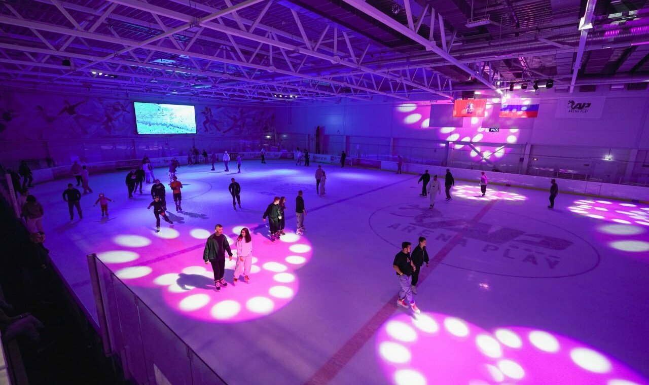 Прокат коньков 450 рублей — на всю ночь (залог — документ/1000 руб.).