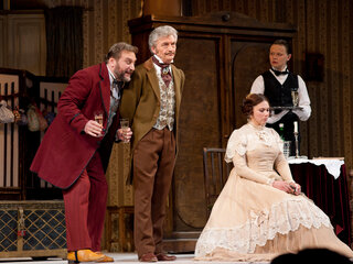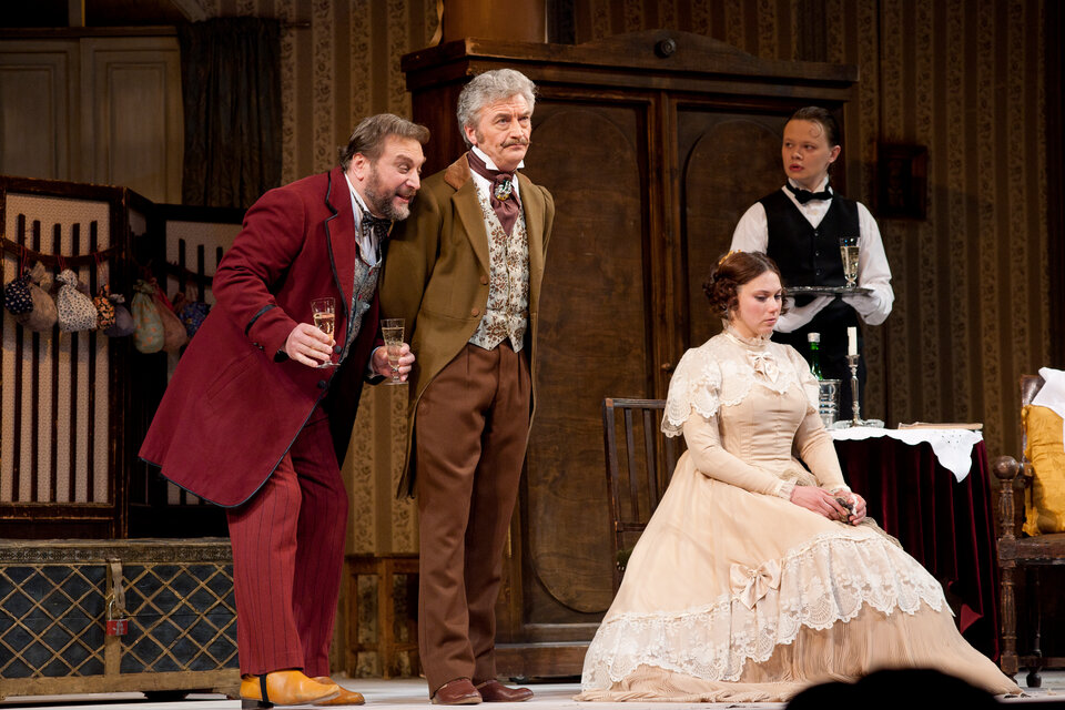 Впервые она была поставлена в Малом театре более 150 лет тому назад. И надо же такому случиться — именно в это время шли в Москве гастроли знаменитой Рашели! «Трудно было удержаться от сопоставления этих зрелищ — слишком нагляден был контраст, и публика Малого театра разбилась на две враждующие партии» — пишет Владимир Лакшин. Часть зрителей роптала против представления на сцене «грубых» русских нравов: «Соединяя «высокое с комическим», в «Бедности не порок» автор перенес на сцену изрядно подзабытый к середине века, особенно в богатых московских домах, мир народного святочного веселья — песен, плясок, обрядов «русского карнавала». Наверное, в его память эти сцены вернулись как эхо воспоминаний замоскворецкого детства. Там было и это до замирания сердца сладкое ожидание праздника, когда на святках появлялись чьи-то румяные лица за морозными окнами, слышались веселые голоса, топот ног и смех в сенях, а потом возникал хоровод масок, коза и медведь с бубном, будто сошедшие с лубочной картинки, бренчанье балалайки или гитары, и старинные песни, гаданья, прибаутки».