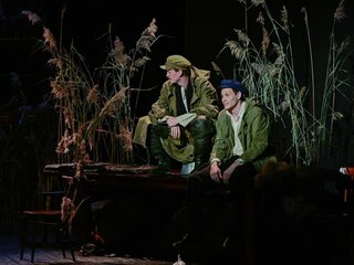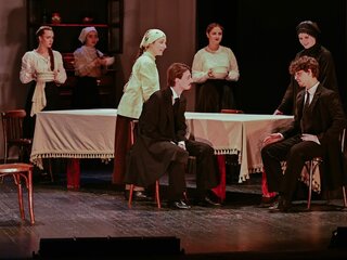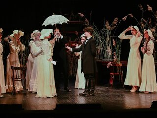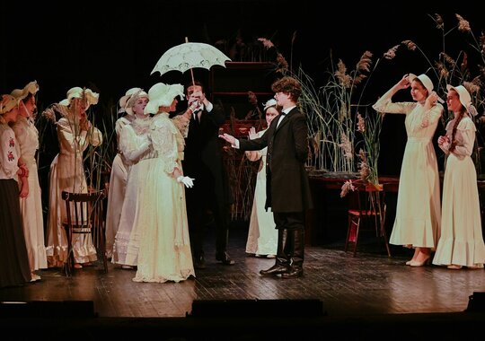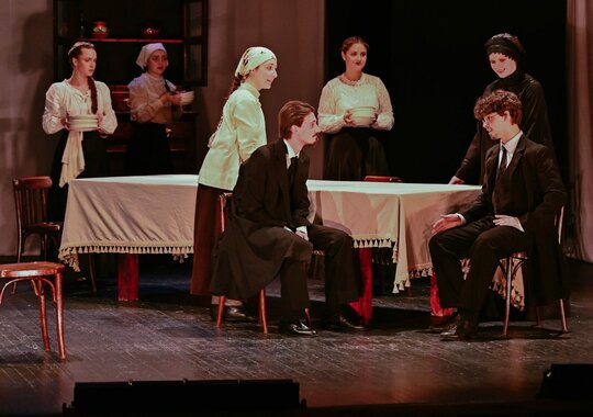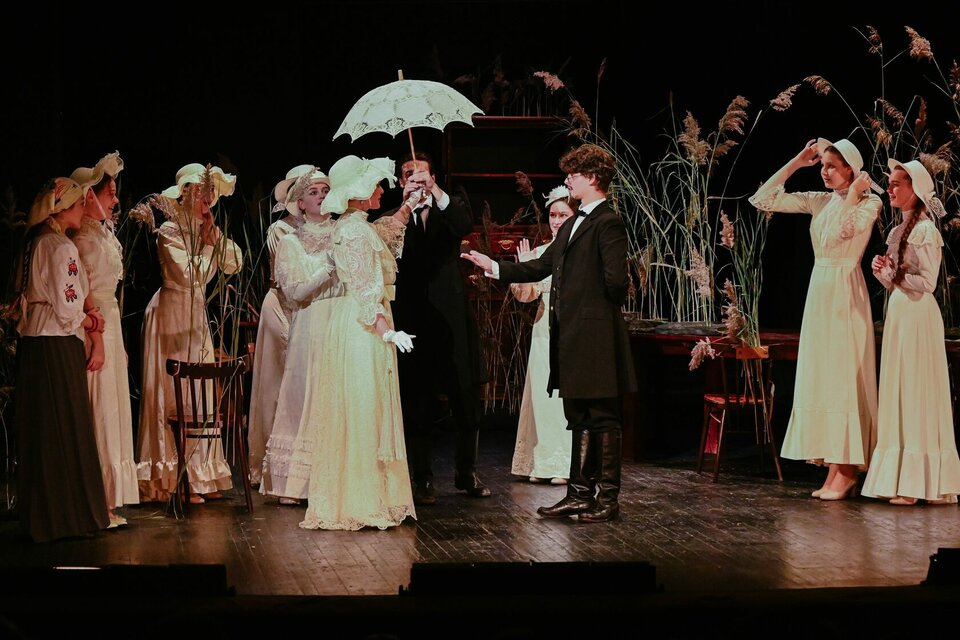 События спектакля «Блаженный остров» происходят в южном городке бывшей Российской империи через два года после прихода большевиков к власти. Трагикомическую историю жизни коллежского асессора Савватия Савельевича Гуски, его жены и семи дочерей написал в 1925 году драматург Микола Кулиш, которого можно поставить в один ряд с М. Булгаковым, Н. Эрдманом, А. Копковым. На сцену Учебного театра историю отправили режиссеры Александр Кузин, Егор Кубрак и студенты выпускного курса артистов драматического театра и кино.