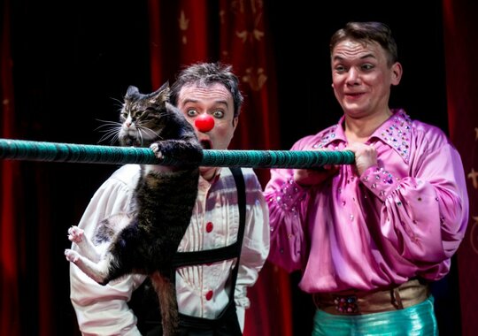 Спектакль «Я — клоун, или Котостройка» это взгляд на великие имена через призму современности и, конечно же, через призму Театра кошек. Входя в образ и исполняя репризы великих клоунов, Дмитрий Куклачев усложняет номера, добавляя в них трюки с кошками.