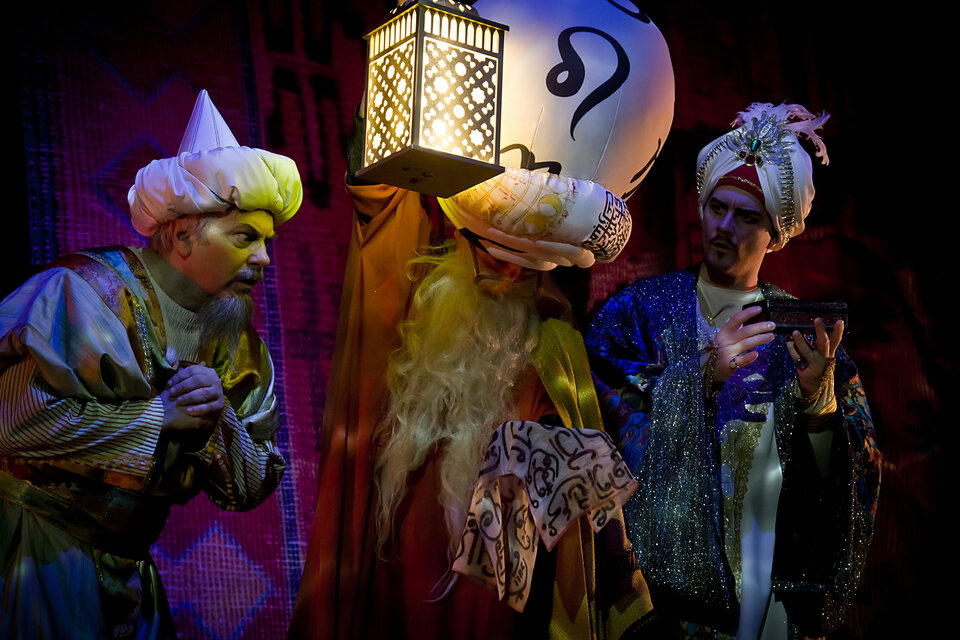 Утончённая и весёлая, красочная и яркая, любимая с детства сказка для наших маленьких зрителей. История про удивительные превращения и искренние чувства, про предательство и верность. Настоящая восточная сказка, переносящая маленьких зрителей в волшебный мир роскошных дворцов и таинственных подземелий, иссушающих пустынь и древних развалин, сказка, наполненная музыкой и танцами. Приключения незадачливого калифа и его верного визиря, козни злого колдуна, страшные маски злых волшебников, спасение прекрасной и таинственной принцессы-совы — лишь малая часть того, что ждёт вас на этом спектакле.