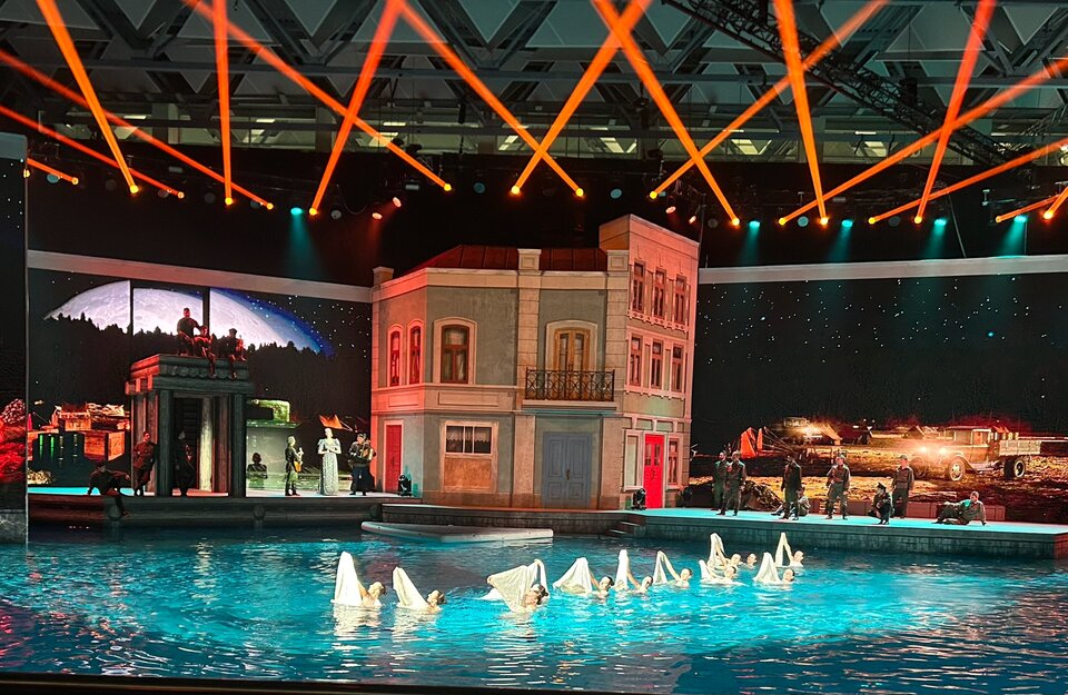 Действие разворачивается одновременно в трёх пространствах: на сцене, на воде и в воздухе. Вас ждут элементы синхронного плавания, прыжков в воду, циркового искусства и оригинальной хореографии. Современные сценические технологии, подводная съёмка и масштабные декорации создают полный эффект погружения в эпоху.