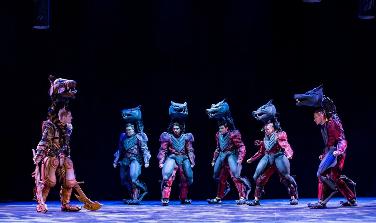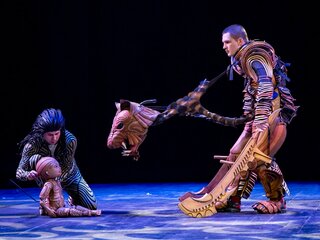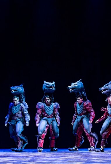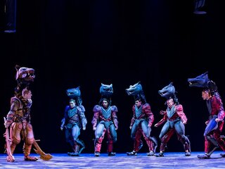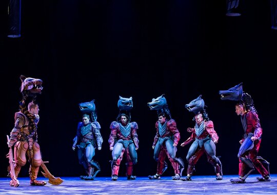 Артисты управляют огромными куклами, сделанными одновременно как ритуальные маски животных и как роботы-трансформеры, работают в сложносочиненном пространстве, поют, отчаянно дерутся.