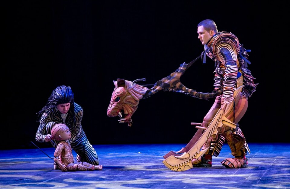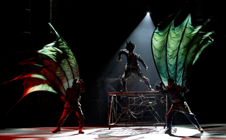 Артисты управляют огромными куклами, сделанными одновременно как ритуальные маски животных и как роботы-трансформеры, работают в сложносочиненном пространстве, поют, отчаянно дерутся.