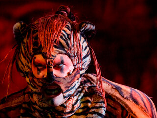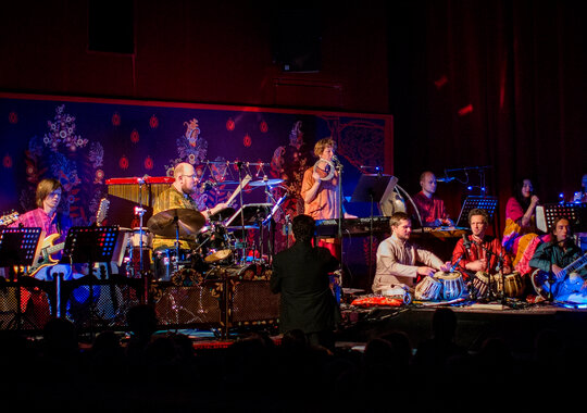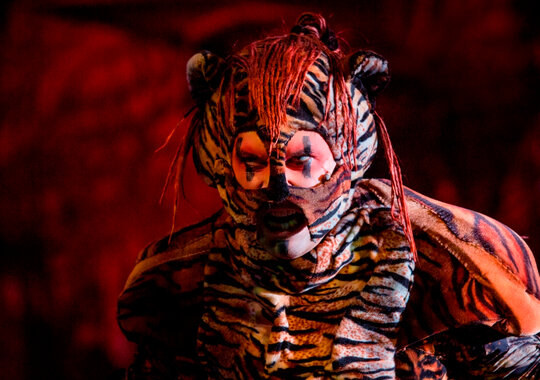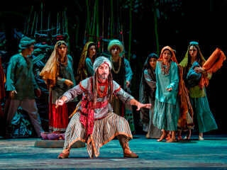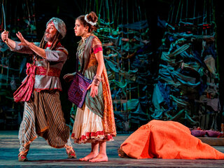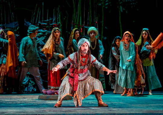 На сцене много боев, которые, как таперы в кино, озвучивает небольшой индийский оркестр, расположенный тут же на сцене. То есть музыканты, заранее договорившись о музыкальной форме того и иного куска, смотрят на сцену и импровизируют. Надо сказать, что музыка в спектакле играет очень важную роль.