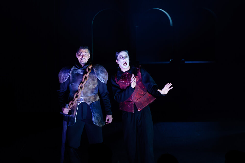 Неоновые вспышки света, кукольная пластика актеров и напряженный ритм спектакля создают атмосферу, где классика встречается с современным театральным языком.