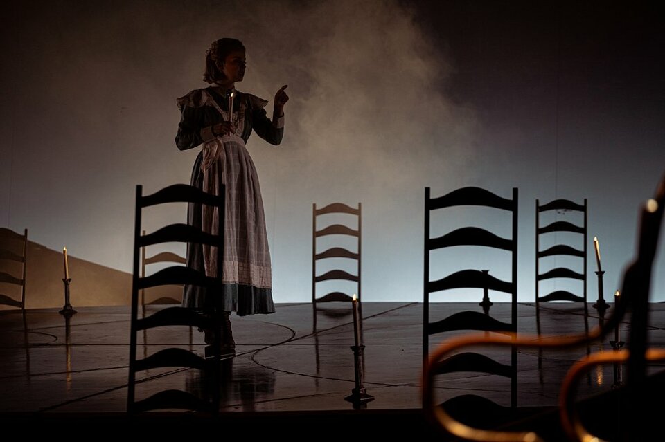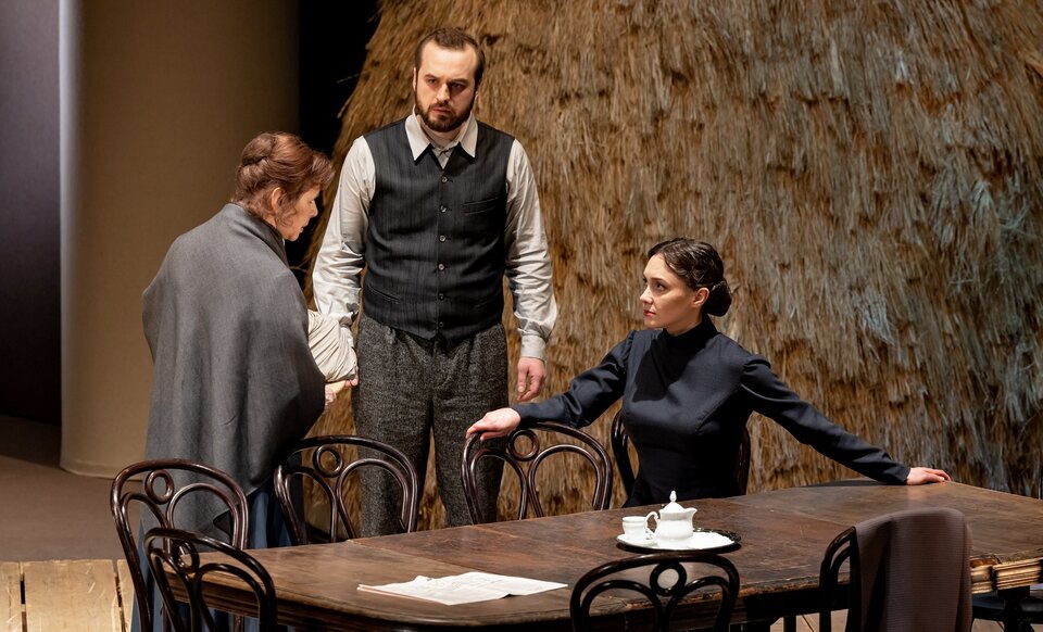 Первая ремарка у Толстого — «молодой и красивый лакей глядится в зеркало и прихорашивается». Ее-то и взяли за основу художник Сергей Бархин и режиссер Миндаугас Карбаускис, воплотив в декорациях само театральное понятие «зеркало сцены». Именно зеркало стало своеобразным паспарту к спектаклю: вот неловкий буфетчик репетирует роковой взгляд, старательно причесывает свою лысину господин Сахатов, лакей Григорий, красуясь, вспоминает свои любовные победы, хозяйка дома, проходя мимо, поправляет свою прическу, а служанка Таня усердно начищает его до блеска тряпкой.