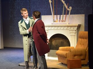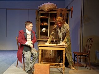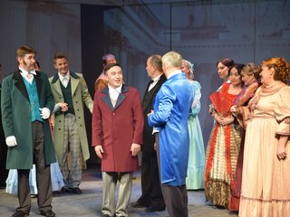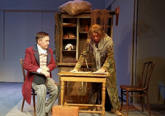В спектакле «Мёртвые души» по одноимённому роману Николая Гоголя выставлены на показ пороки и пагубные привычки сытых, но пустых и продажных помещиков и чиновников в первой половине XIX века.