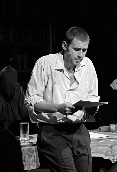 В спектакле режиссера Дарьи Макаровой и художницы Анастасии Сэмбон герой в исполнении Семена Шкаликова путешествует по тексту, перевоплощаясь в разных персонажей. Кто он для мира — Убийца? Жертва? Адвокат? Следователь? Судья? — все эти роли ему предстоит сыграть на протяжении спектакля. Пройти по пути исповеди герою помогает некто Сопровождающий, постоянно меняющий маски и способный быть кем угодно, даже огромной мухой на столе прокурора.