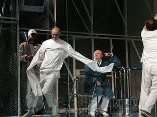 Спектакль полон кинематографических эффектов, а в первые моменты действие даже напоминает трансляцию из психиатрической больницы. Здесь каждый занимается своим делом: медсестра насаждает строгие порядки, больные ездят на каталках или карабкаются по металлической сетке. И вот в этом царстве неоновых ламп и белого кафеля появляется Макмэрфи — бунтарь и революционер. Все действие он будет разрушать устоявшийся порядок, пытаясь расшевелить постояльцев клиники...