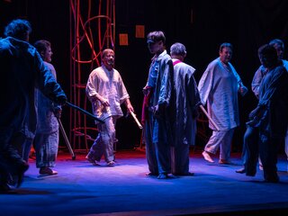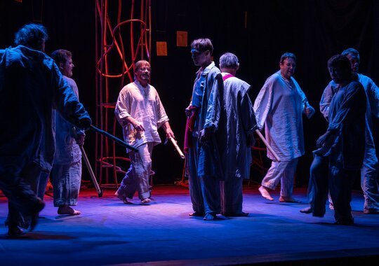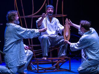 Музыка спектакля — вариации старинных народных песен уральских (яицких) казаков, звуки и наигрыши на редких народных инструментах, атмосферное звучание передвижной колокольни.